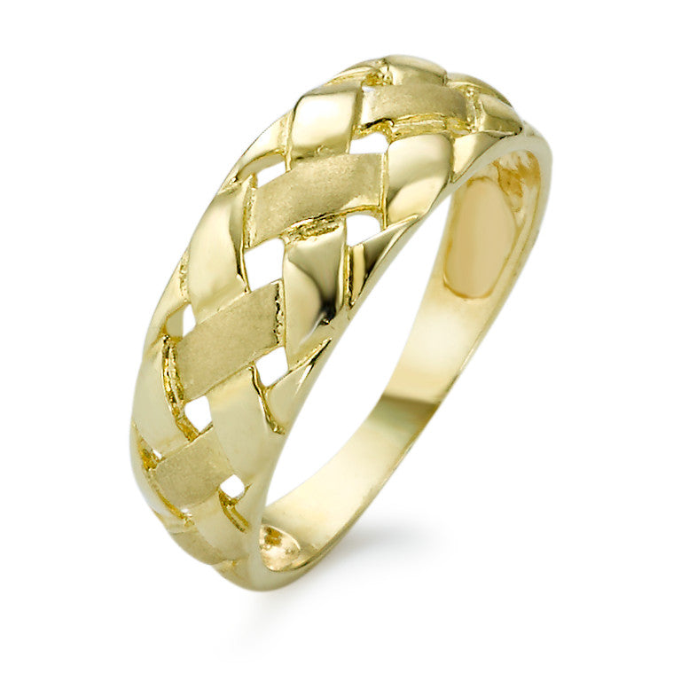 Anillo para mujer elaborado en oro amarillo 375. Su diseño entrelazado combina acabados mate y brillantes, ofreciendo un estilo elegante y moderno. Perfecto para cualquier ocasión, este anillo aporta un toque sofisticado y femenino a tu look diario.