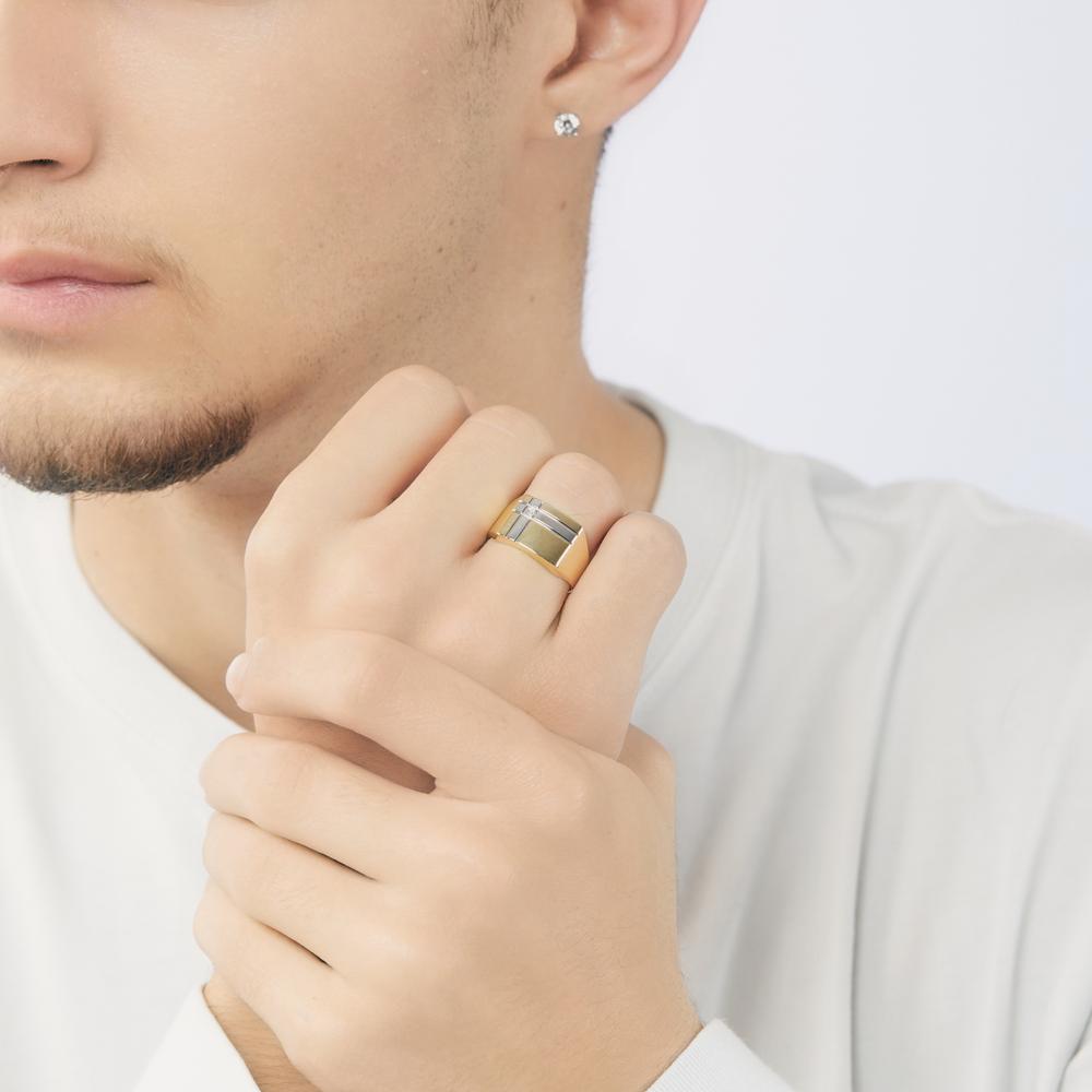 Anillo de hombre elegante fabricado en oro amarillo de 375, con un diseño moderno que incluye detalles en oro blanco. Cuenta con un diamante central que aporta brillo y sofisticación. Perfecto para un estilo distinguido y contemporáneo.