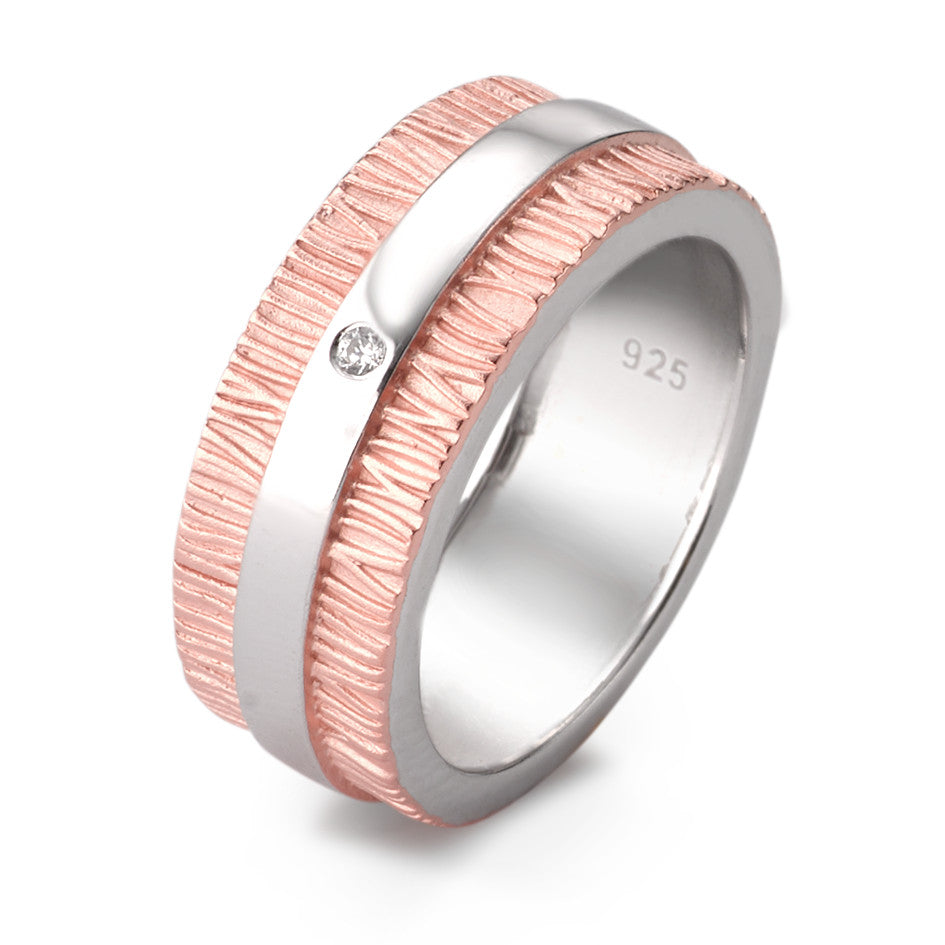 Anillo para mujer en plata de ley 925 con diseño bicolor en plata y tono rosa. Incluye un brillante circonio cúbico que aporta elegancia y brillo. Ideal para combinar con cualquier look, este anillo une estilo moderno y sofisticación en una pieza única.