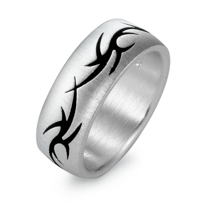 Anillo para hombre de plata con diseño tribal negro. Su acabado mate y su estilo moderno lo convierten en un accesorio ideal para un look masculino y atrevido. Perfecto para quienes buscan un detalle único y elegante en su día a día. Calidad y estilo en un solo anillo.