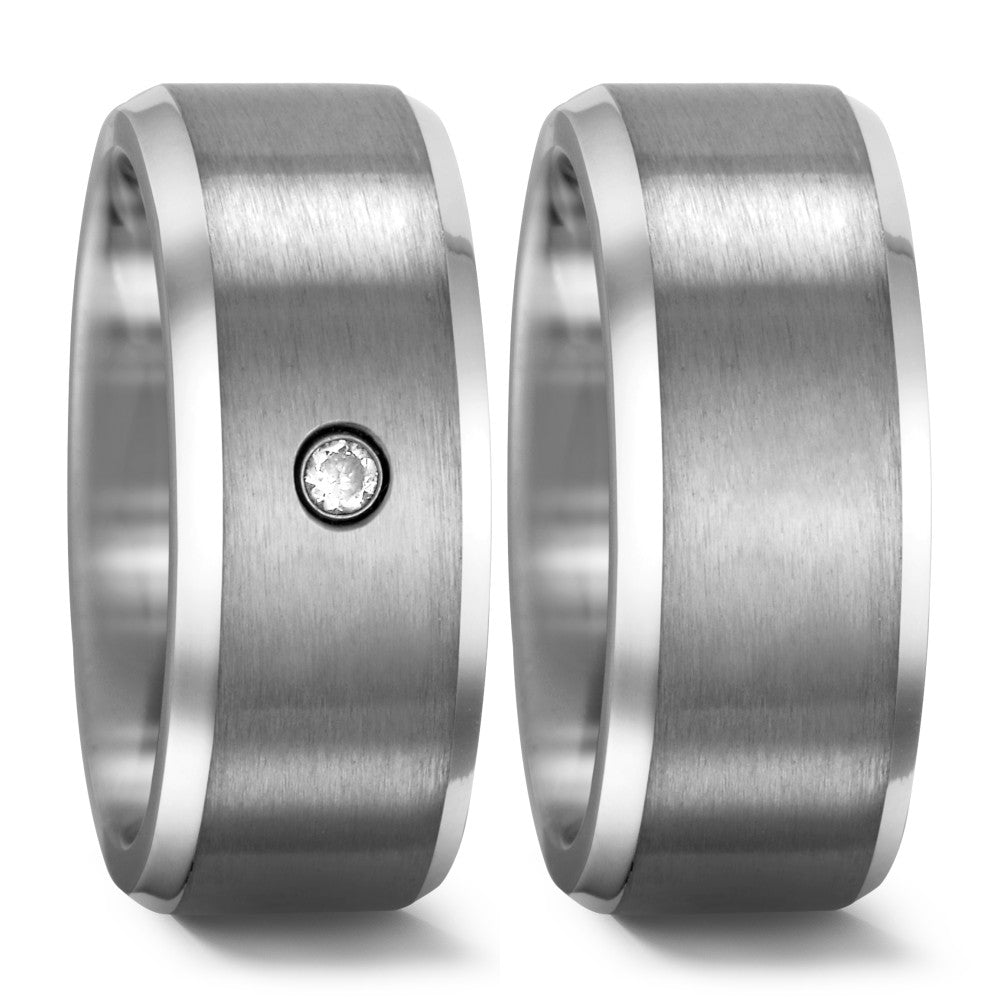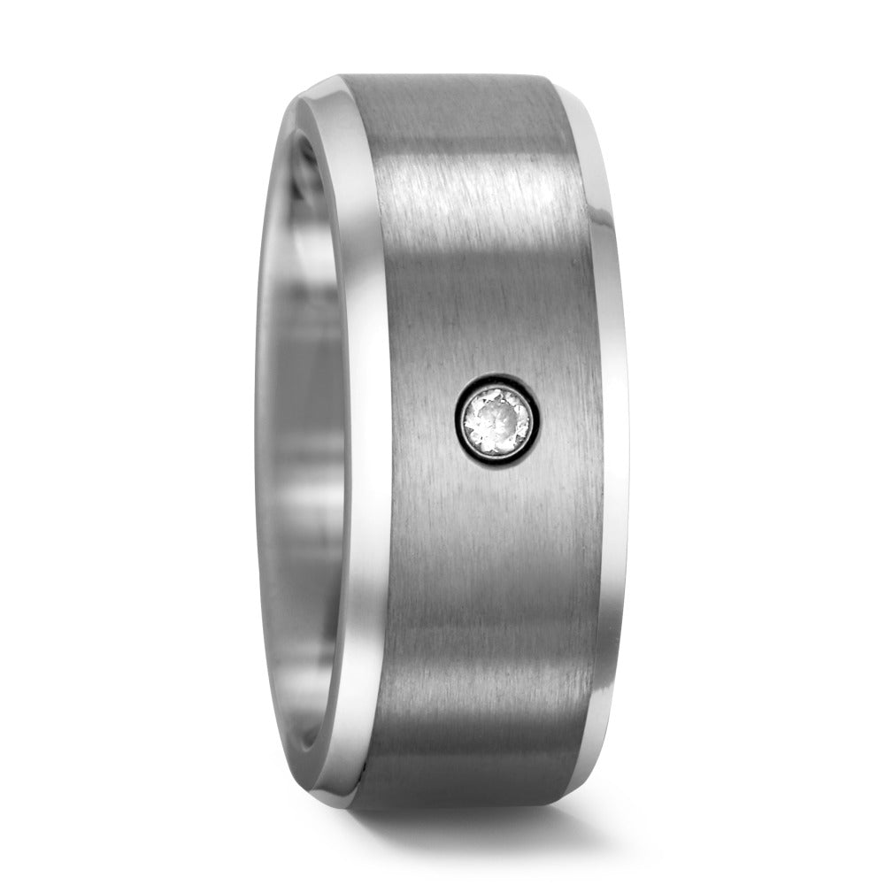 Anillo de titanio para mujer, elegante y moderno, con acabado mate y bordes pulidos. Destaca por un brillante circonio incrustado que aporta un toque sofisticado. Diseño resistente y ligero, ideal para uso diario y ocasiones especiales.