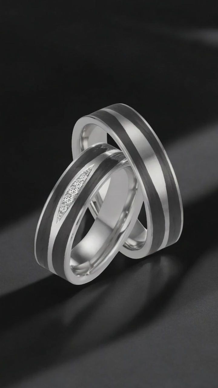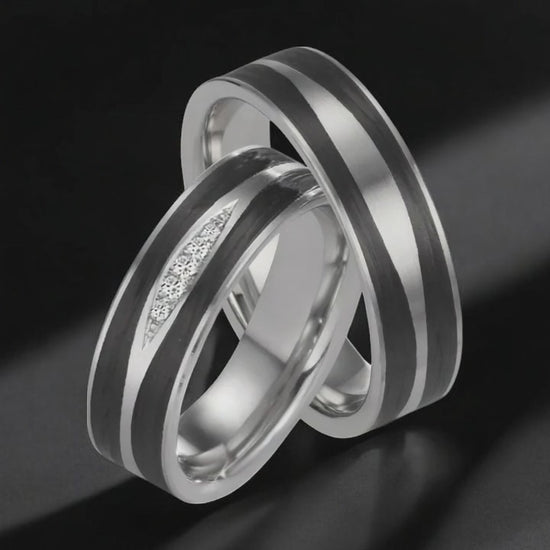 Anillo de pareja hecho en platino 950 con incrustaciones de carbono, que combina la elegancia del platino con la modernidad del carbono. Diseño único y resistente, perfecto para simbolizar la unión y compromiso con estilo contemporáneo y sofisticado.