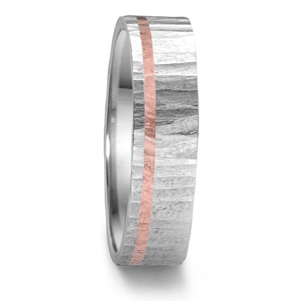Anillo de pareja elegante en acero inoxidable con una franja de oro rojo 750. Diseño moderno y robusto, ideal para simbolizar el amor y compromiso. Acabado ligeramente martillado que aporta textura y estilo único. Perfecto para uso diario y ocasiones especiales.