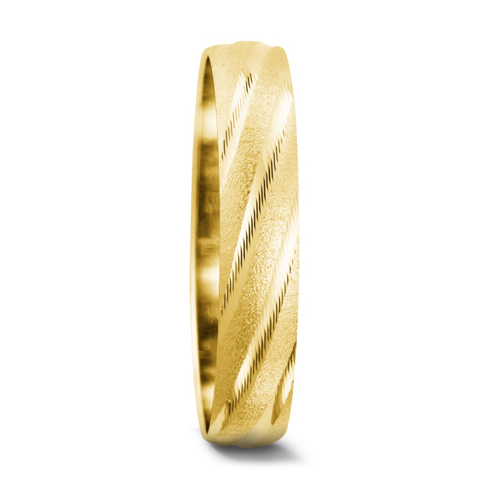 Anillo de pareja elegante hecho de oro amarillo 375. Su diseño clásico con un acabado texturizado y detalles brillantes crea un estilo atemporal para celebrar el amor y la unión. Perfecto para simbolizar momentos especiales y compromisos duraderos.
