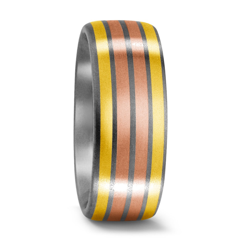 Anillo de pareja elegante hecho de titanio con franjas de oro amarillo 750 y oro rojo 750. Diseño moderno y duradero, perfecto para simbolizar el amor y compromiso. Combinación única de metales preciosos que aporta estilo y resistencia para uso diario.