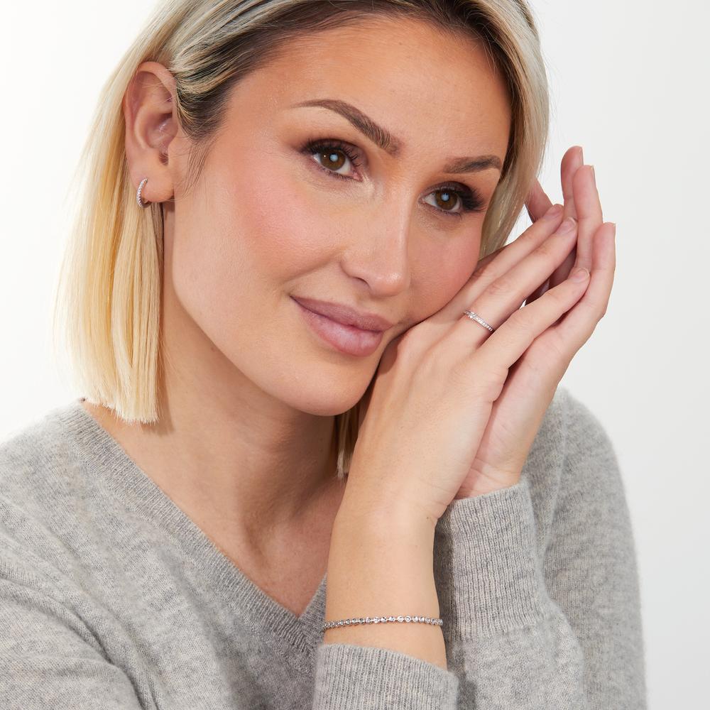 Elegantes pendientes de aro para mujer, fabricados en oro blanco de 18 quilates (750). Decorados con brillantes diamantes que aportan un brillo sofisticado. Diseño de cierre abatible para mayor comodidad y seguridad. Perfectos para cualquier ocasión especial.