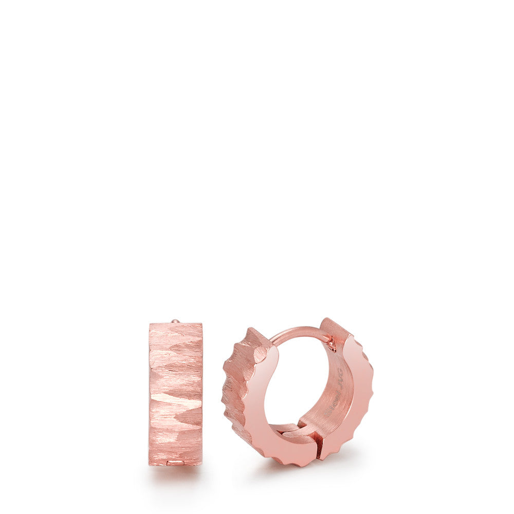 Aros de acero inoxidable para mujer con diseño plegable. Su acabado en tono rosado y textura facetada los hace modernos y elegantes, perfectos para cualquier ocasión. Resistentes y cómodos, combinan estilo y durabilidad en un accesorio imprescindible.