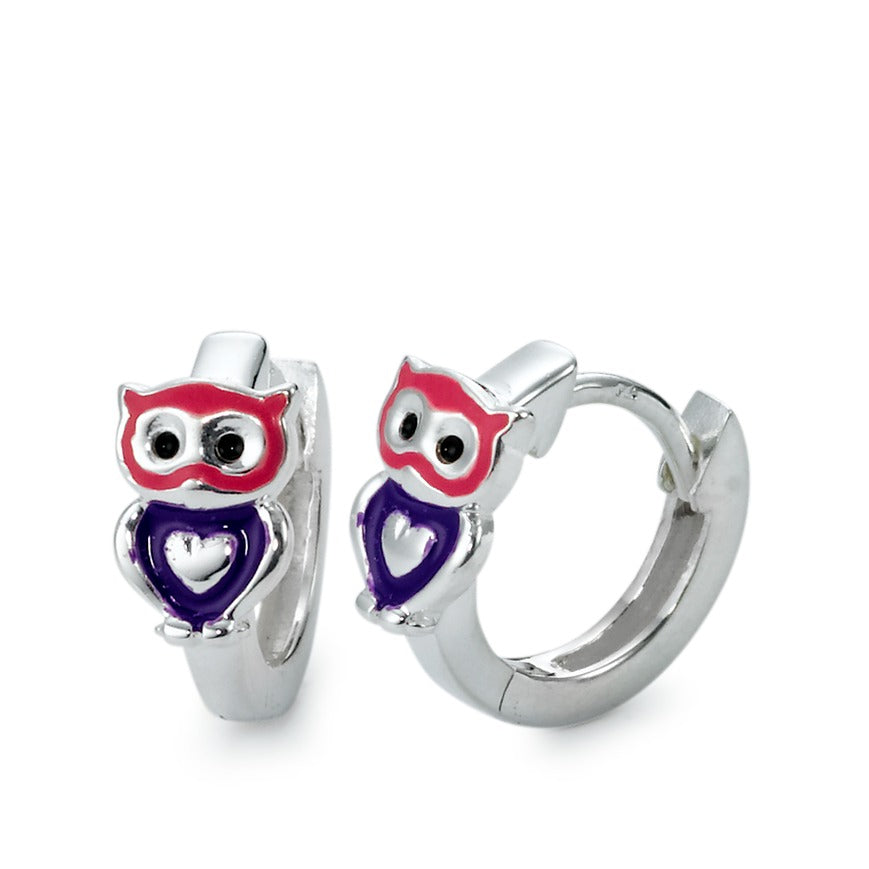 Aros de plata para niñas con diseño de búho colorido. Estos aros pequeños y ligeros cuentan con un cierre de bisagra seguro, ideales para el uso diario. Un accesorio encantador y divertido que aporta un toque juvenil y original a cualquier atuendo.