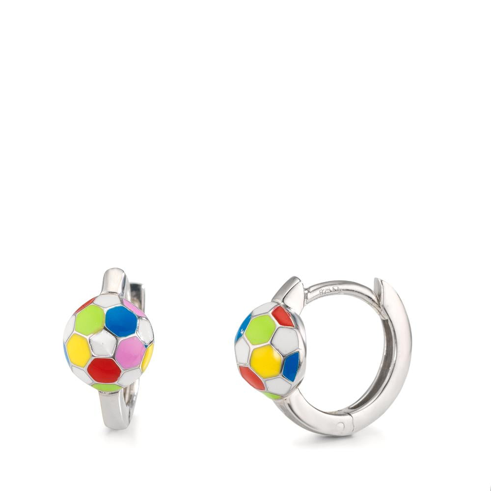 Aros para niños en plata con diseño de balón de fútbol multicolor. Elegantes y divertidos, perfectos para los pequeños amantes del deporte. Cierre de bisagra que asegura comodidad y seguridad. Un accesorio ideal para uso diario con un toque alegre y deportivo.