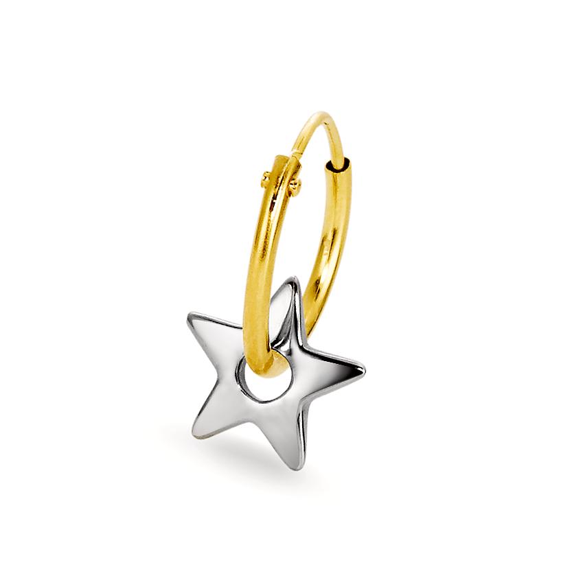 Pendiente de aro para hombre elaborado en oro amarillo 18 quilates (750). Incluye un colgante en forma de estrella de plata, ofreciendo un diseño moderno y elegante. Perfecto para un estilo sofisticado y distintivo. Ideal para uso diario o ocasiones especiales.