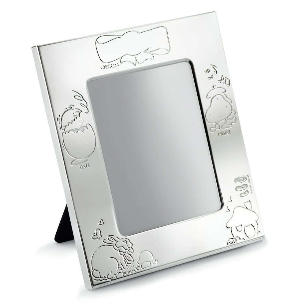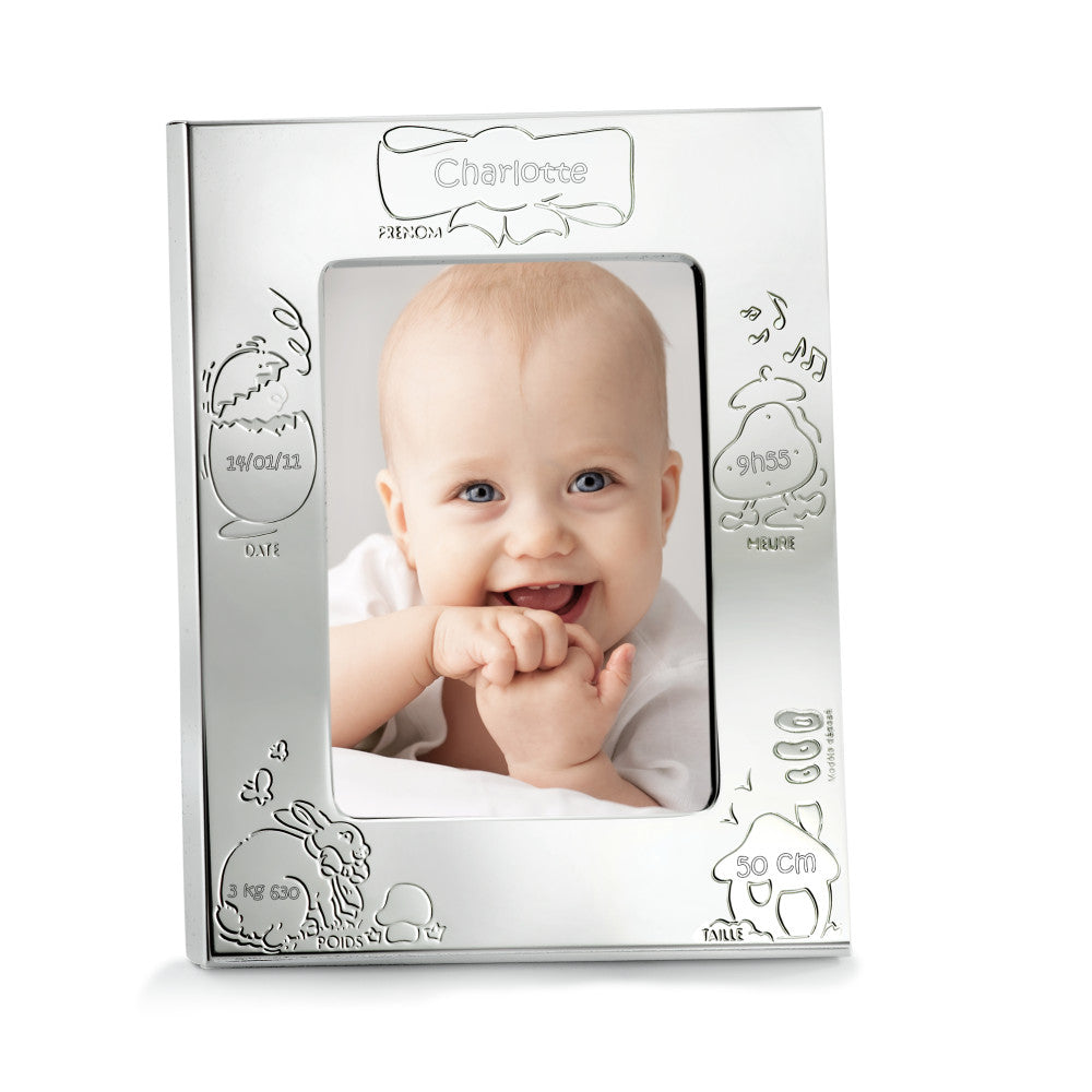 Marco de fotos para bebé con diseño encantador y detalles grabados. Ideal para capturar y conservar los momentos más especiales. Perfecto regalo para recién nacidos, con espacio para personalizar nombre, fecha y otros datos importantes. Material resistente y acabado brillante.