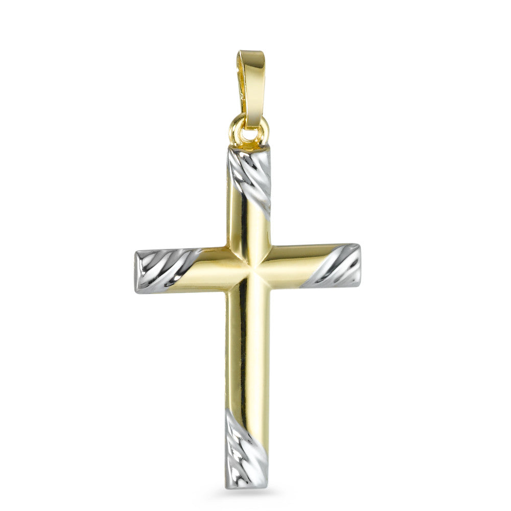 Colgante cruz elegante fabricado en oro amarillo 750. Este diseño clásico con detalles en oro blanco resalta la fe y el estilo con un toque moderno y sofisticado. Perfecto para lucir en cualquier ocasión especial o como símbolo cotidiano.