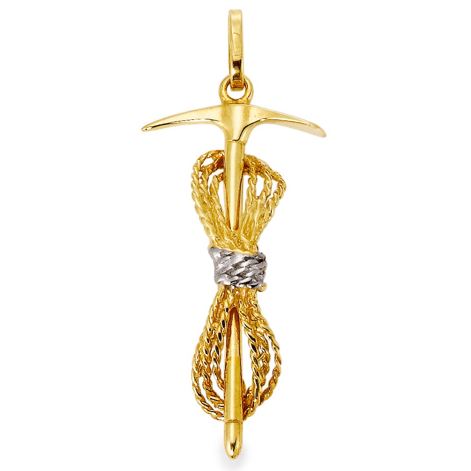 Colgante para hombre en oro amarillo 750, con diseño inspirado en el alpinismo. Presenta un piolet detallado con cuerda entrelazada, símbolo perfecto para amantes de la montaña y la aventura. Un accesorio elegante y único que refleja pasión y estilo en cada detalle.