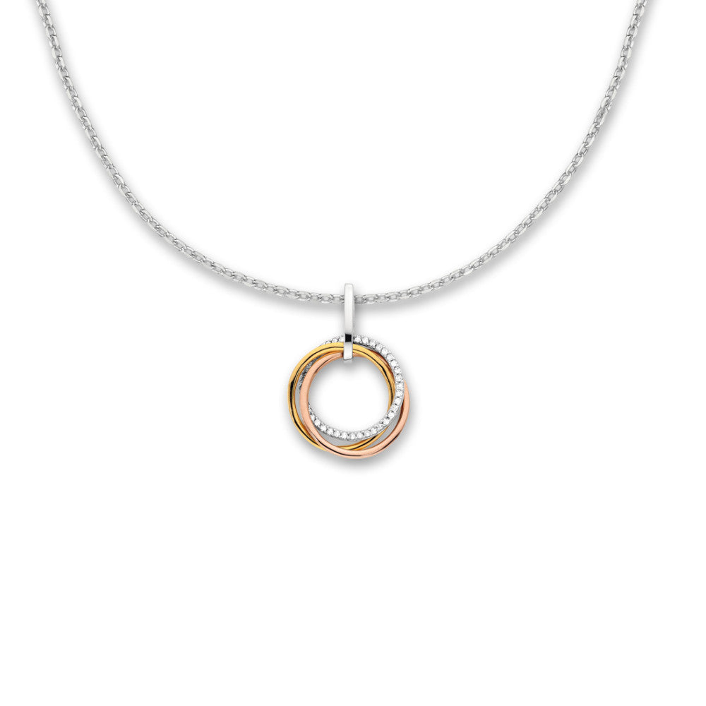Colgante para mujer elegante, confeccionado en oro blanco, amarillo y rosa de 18 quilates (750). Decorado con diamantes que añaden un brillo sofisticado. Un accesorio versátil y atemporal para realzar cualquier look con estilo y elegancia.