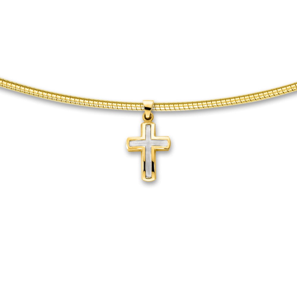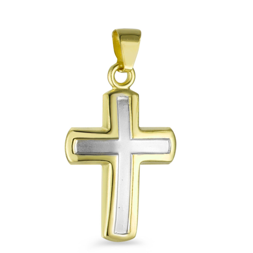 Colgante en cruz fabricado en oro amarillo 375 de alta calidad con detalles en blanco. Su diseño clásico y elegante lo convierte en un accesorio ideal para uso diario o como un regalo significativo. Perfecto para resaltar tu estilo con un toque de sofisticación y espiritualidad.
