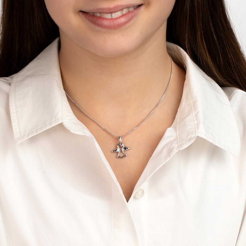 Colgante de niña en plata, con diseño de ángel delicado y elegante. Perfecto para regalar a niñas o para llevar un símbolo de protección y ternura cerca del corazón. Ligero y con acabado brillante, ideal para uso diario o ocasiones especiales.