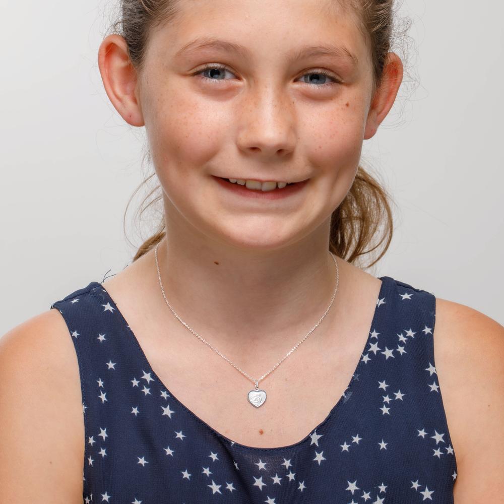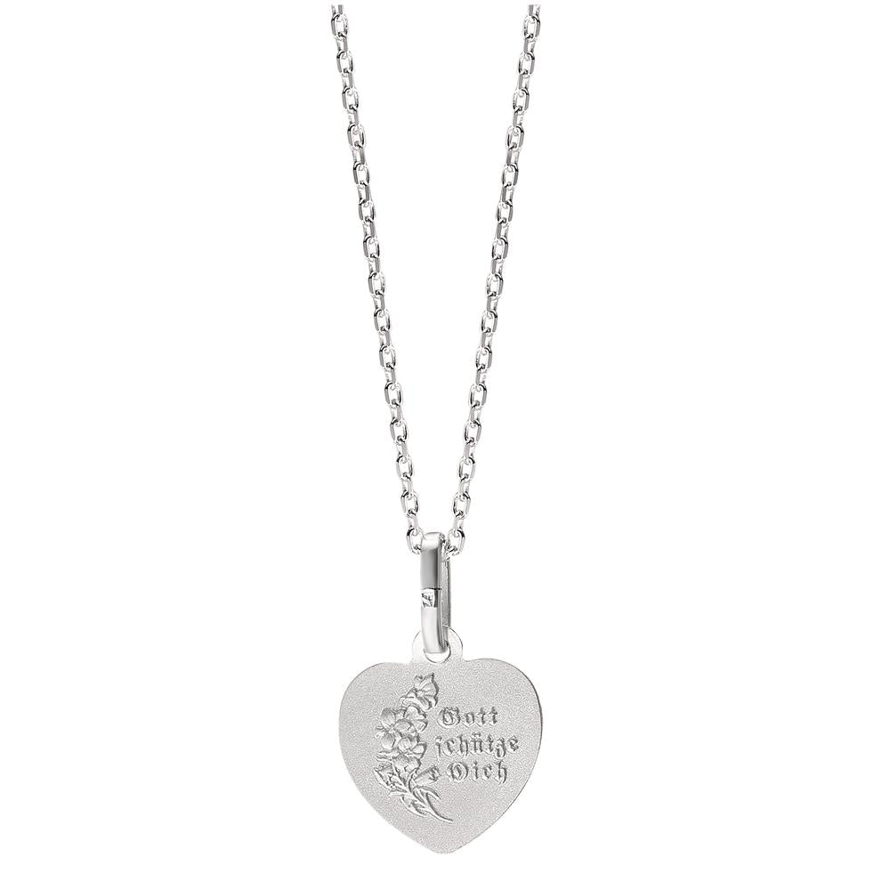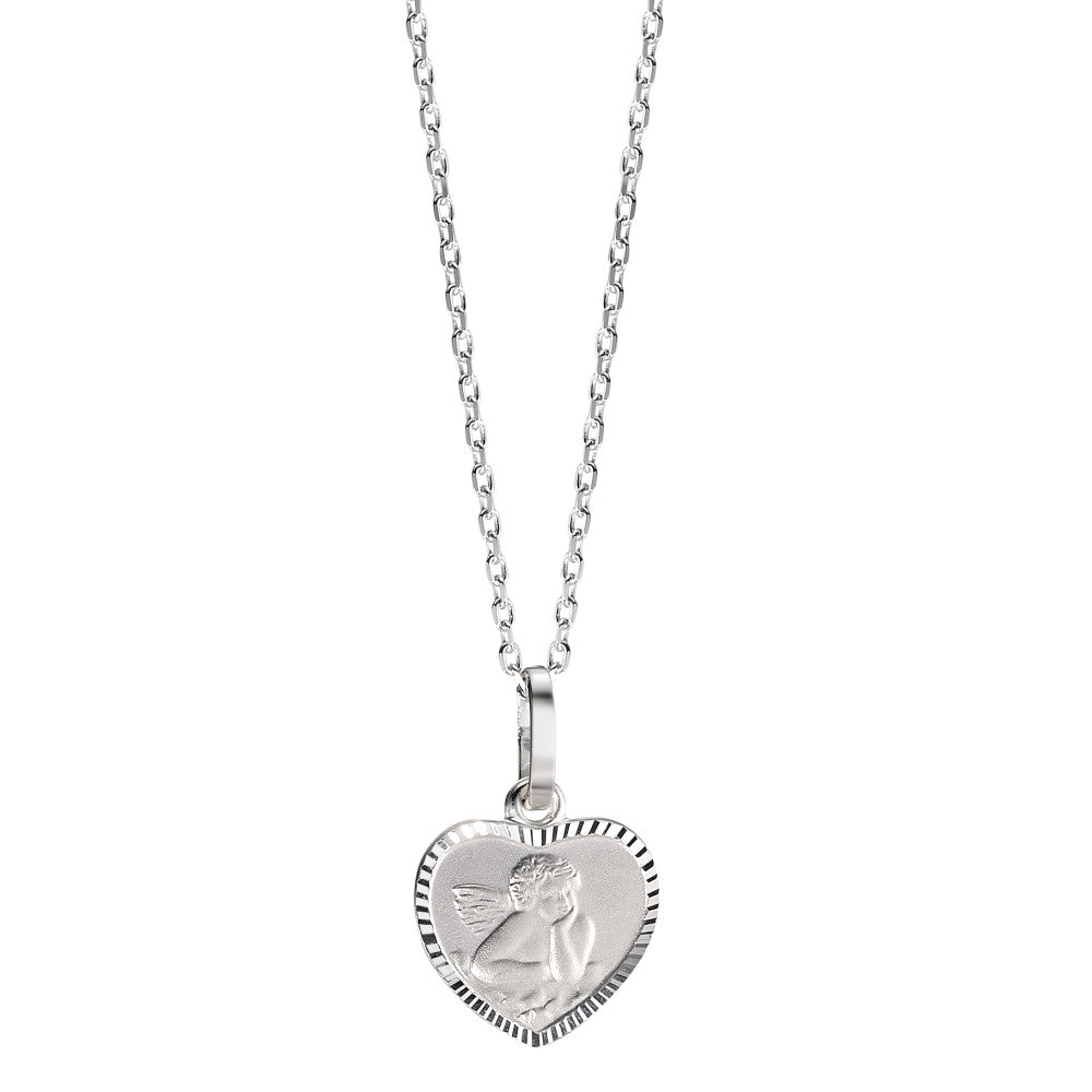Collar para bebé en plata con colgante en forma de corazón que muestra un ángel de la guarda. Diseño delicado y seguro, perfecto para proteger y acompañar a los más pequeños con un símbolo de amor y protección eterna. Ideal como regalo especial y significativo.