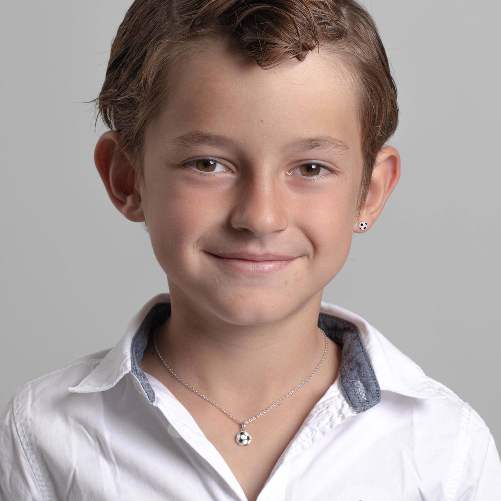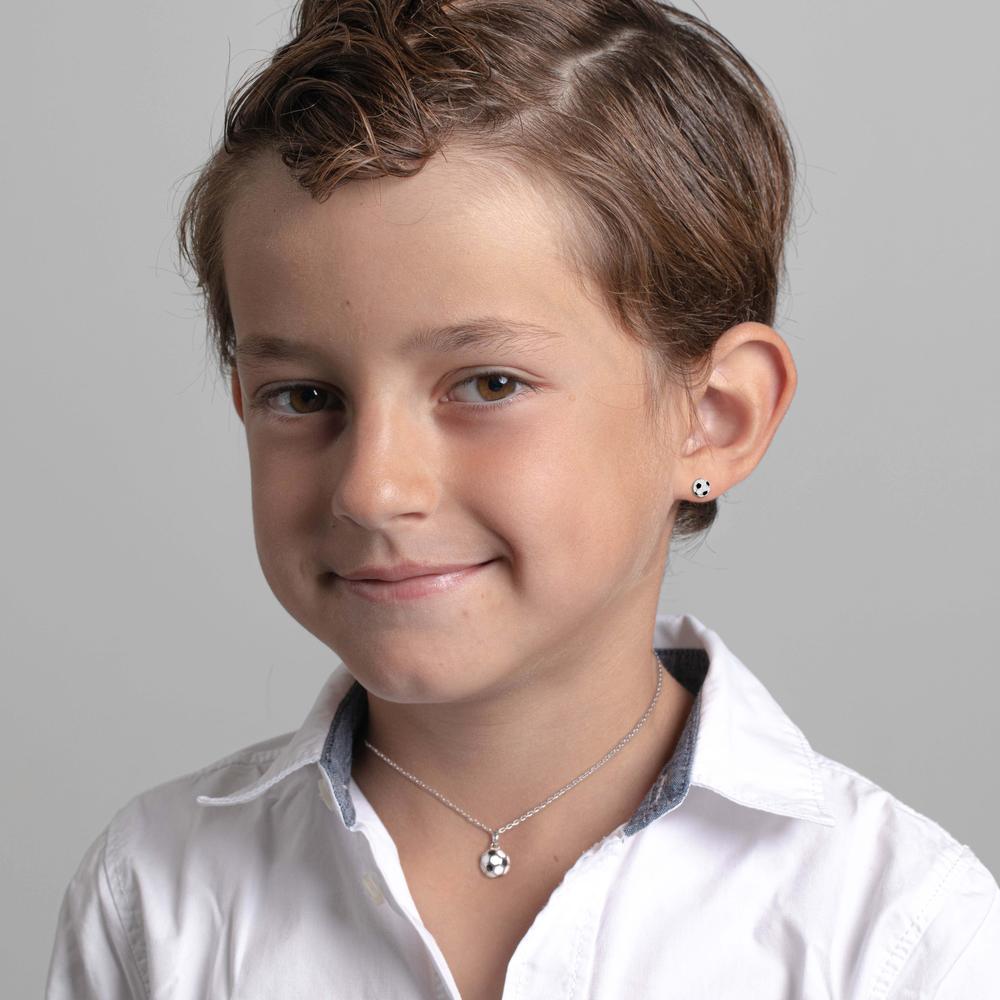 Collar para niños con colgante de plata en forma de balón de fútbol. Diseño moderno y deportivo, perfecto para los pequeños amantes del fútbol. Fabricado en plata de alta calidad, combina estilo y durabilidad en un accesorio único. Ideal como regalo especial.