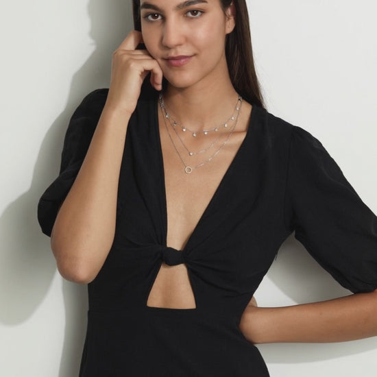Collar de mujer en plata elegante y moderno, adornado con circonitas brillantes que añaden un toque de sofisticación. Su diseño de doble cadena con detalles delicados lo convierte en el complemento ideal para cualquier ocasión, aportando luminosidad y estilo.