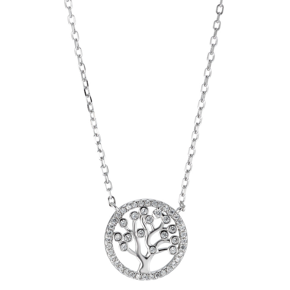 Collar para mujer de plata con diseño de árbol de la vida. Decorado con brillantes circonias que aportan un toque elegante y moderno. Perfecto para complementar cualquier look, simbolizando crecimiento y renovación. Ideal para regalar o para uso diario con estilo.