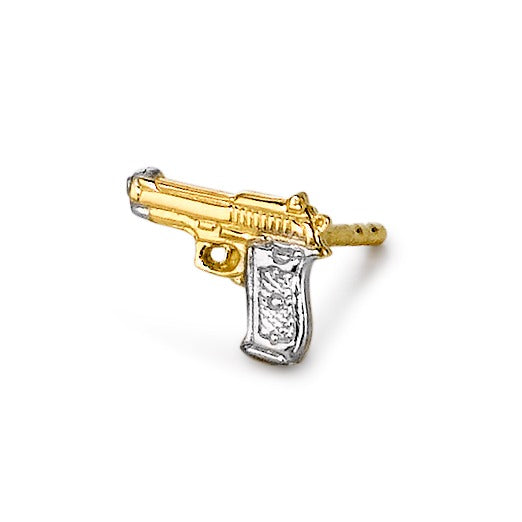Pendiente para hombre en forma de pistola, realizado en oro amarillo de 18 quilates (750). Un diseño original y audaz que combina detalles en dorado y plateado, ideal para quienes buscan un estilo único y moderno. Incluye cierre de presión para mayor comodidad.