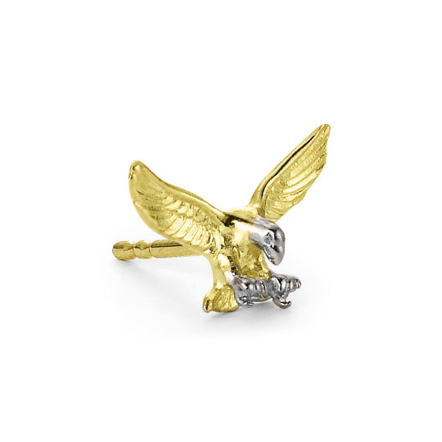 Pendiente para hombre, pieza única en oro amarillo 750. Diseñado con un águila en vuelo, símbolo de fuerza y libertad. Ideal para un estilo masculino y sofisticado, combina elegancia y personalidad en una joya exclusiva. Perfecto para lucir con carácter cada día.