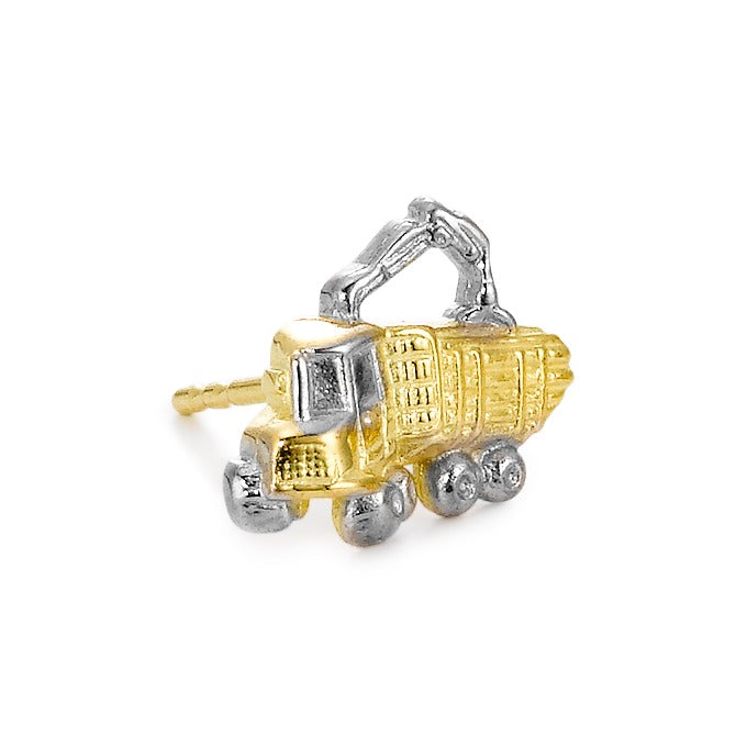 Pendiente para hombre de oro amarillo 750, diseño exclusivo en forma de camión. Un solo pendiente con detalles en oro blanco, ideal para quienes buscan un estilo único y original. Cierre seguro y cómodo para uso diario. Perfecto para regalos con personalidad.