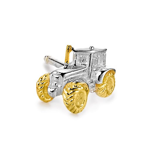 Pendiente para hombre de plata con diseño de tractor. Un accesorio original y detallado que combina plata y detalles dorados en las ruedas. Perfecto para quienes buscan un estilo único y llamativo en su look diario. Incluye 1 unidad.