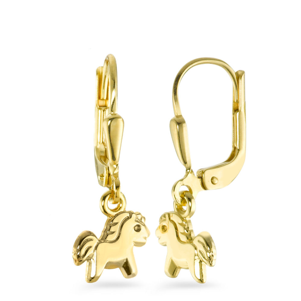 Pendientes para niña en oro amarillo 375, con encantadores colgantes de caballo. Diseño delicado y divertido, perfecto para las pequeñas amantes de los animales. Ligero y cómodo para uso diario, combina ternura y elegancia en una joya especial.