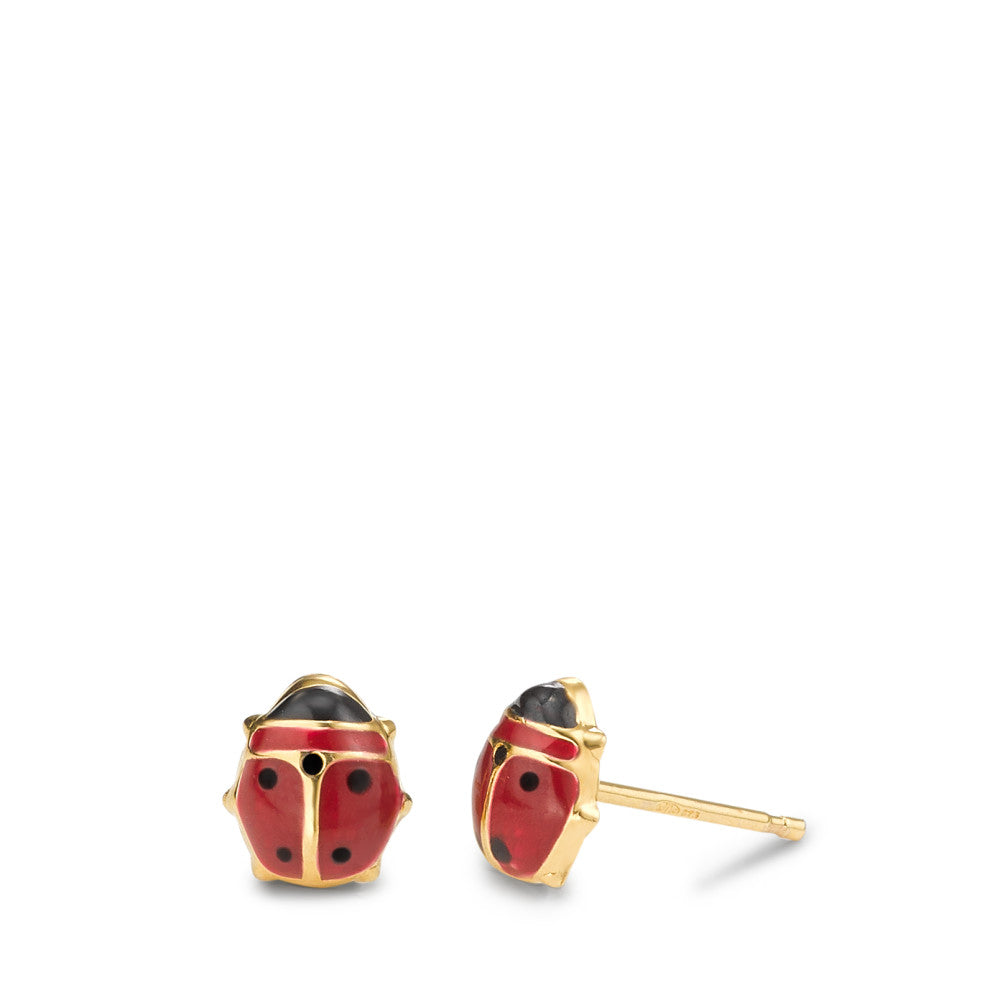 Pendientes para niña en oro amarillo 375, con diseño de mariquita esmaltada en rojo y negro. Un accesorio delicado y encantador que aporta un toque de alegría y protección, ideal para el día a día o como regalo especial. Calidad y estilo en cada detalle.