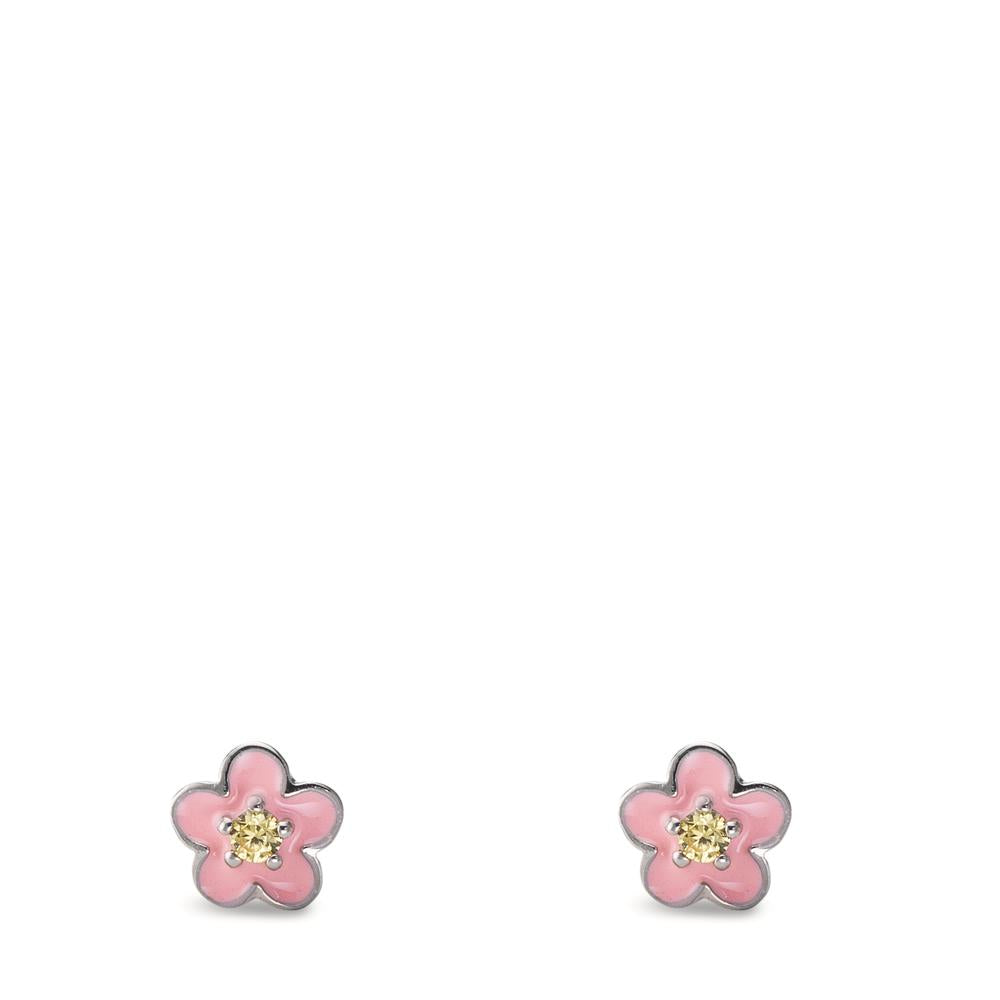 Pendientes de plata para niña con diseño de flor rosa y centro decorado con circonita amarilla. Delicados y elegantes, ideales para uso diario o para ocasiones especiales. Un accesorio encantador que aporta un toque de color y brillo sutil para las más pequeñas.