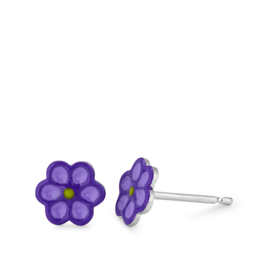 Pendientes de botón para niñas en plata con diseño de flor morada. Ideales para el día a día, son delicados y cómodos. Perfectos para regalar o complementar cualquier look infantil con un toque de color y estilo alegre. Material hipoalergénico y duradero.