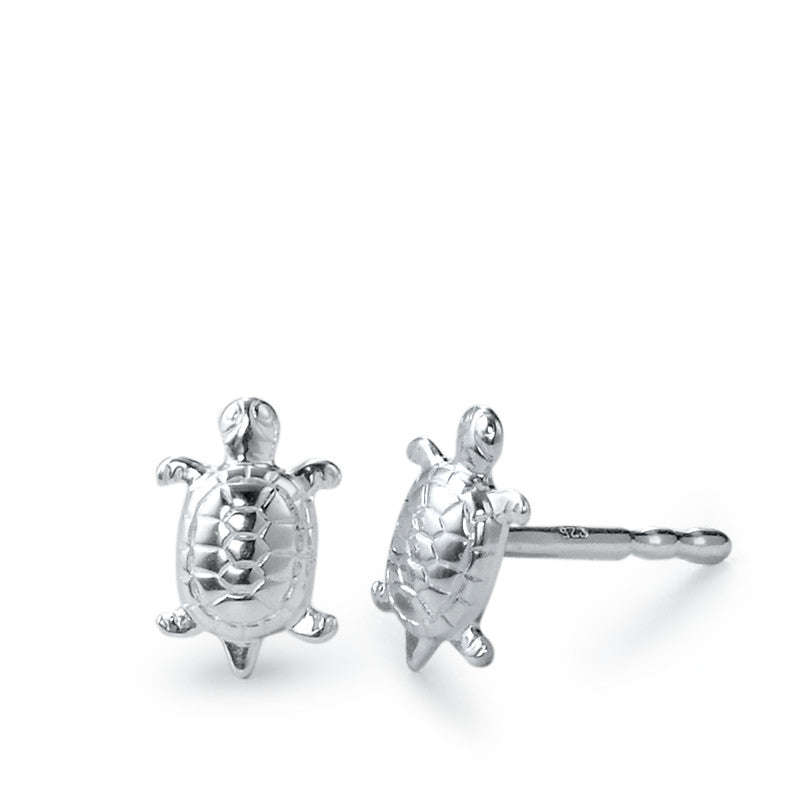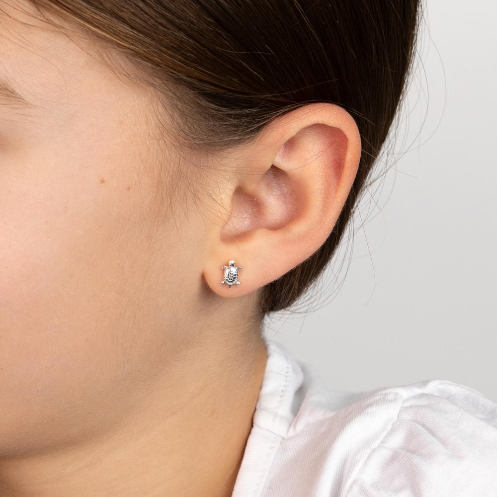 Pendientes de botón para niña en plata con diseño de tortuga. Pequeños y delicados, perfectos para el día a día o como un regalo especial. Su forma detallada y acabado brillante aportan un toque adorable y elegante para las más jóvenes.