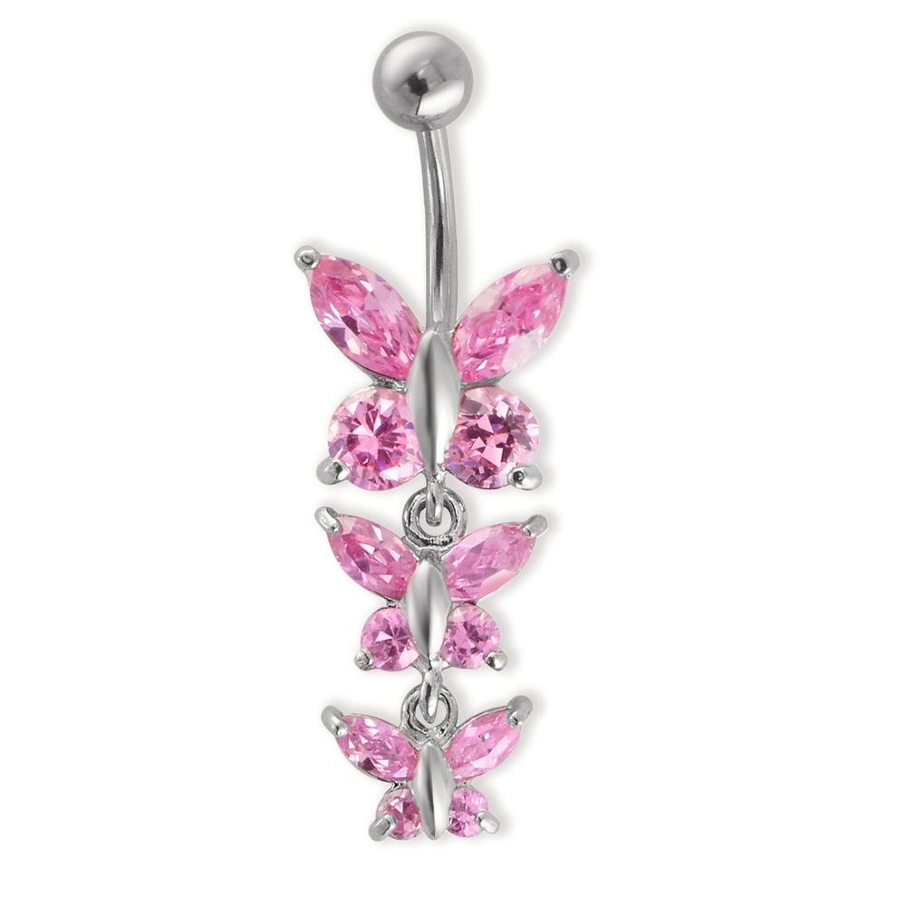 Elegante piercing de ombligo para mujer, fabricado en acero inoxidable de alta calidad. Decorado con tres mariposas adornadas con brillantes circonitas rosas que añaden un toque femenino y delicado. Perfecto para realzar tu estilo con un detalle único y sofisticado.