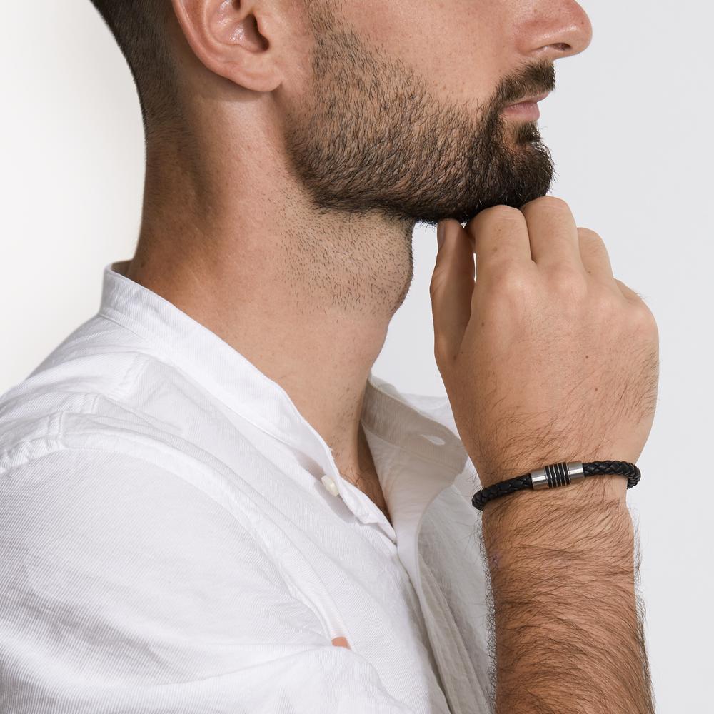 Pulsera para hombre de diseño elegante, combinando cuero trenzado negro con acero inoxidable y detalles en cerámica. Resistente y moderna, perfecta para el uso diario o para ocasiones especiales. Añade un toque sofisticado y masculino a cualquier estilo.