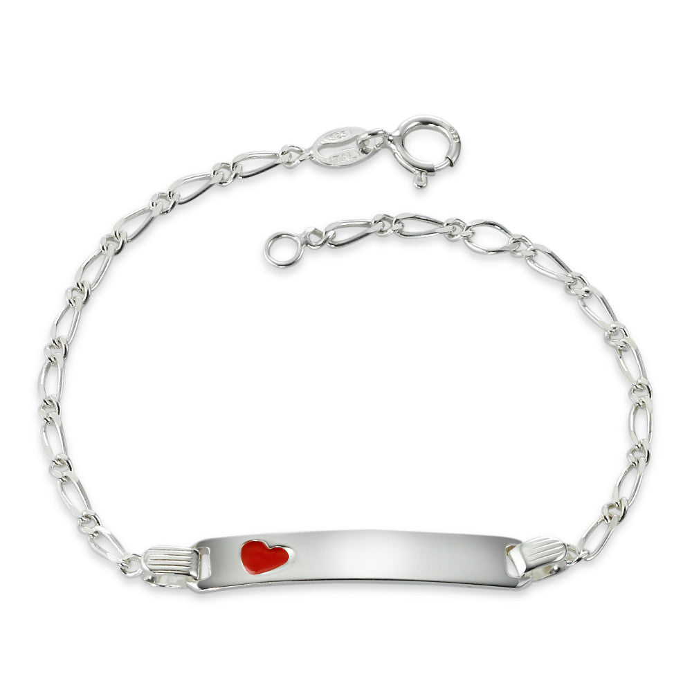 Pulsera para niña de plata con placa para grabado. Diseño delicado con cadena elegante y un pequeño corazón rojo que aporta un toque especial y tierno. Ideal para personalizar con nombre o mensaje, un regalo perfecto para ocasiones especiales.
